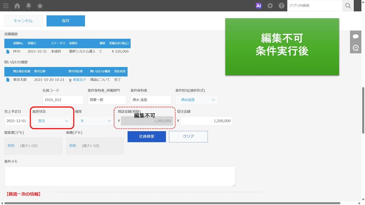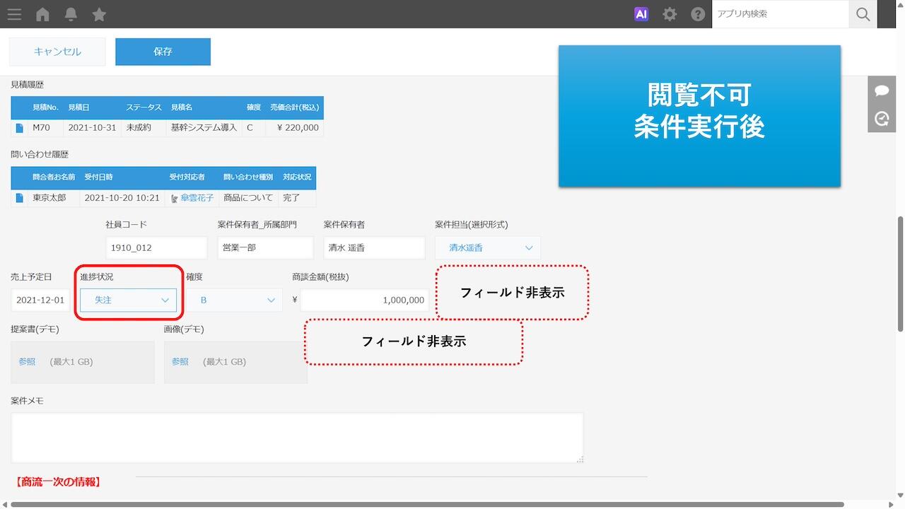 あるフィールドAの値がある値に変更された時、連動してフィールドBを閲覧不可、編集不可にしたい、ということはありませんか。フィールドAの値、数値、日付などの条件を設定し、閲覧または編集(あるいはその両方)をタイミングを決めて不可にすることで、そのレコードを確定情報として扱い、無用な更新が実行されないように制限をかけることができます。案件情報や販売情報など、比較的多くのメンバーで更新・共有されるデータの管理に最適です。